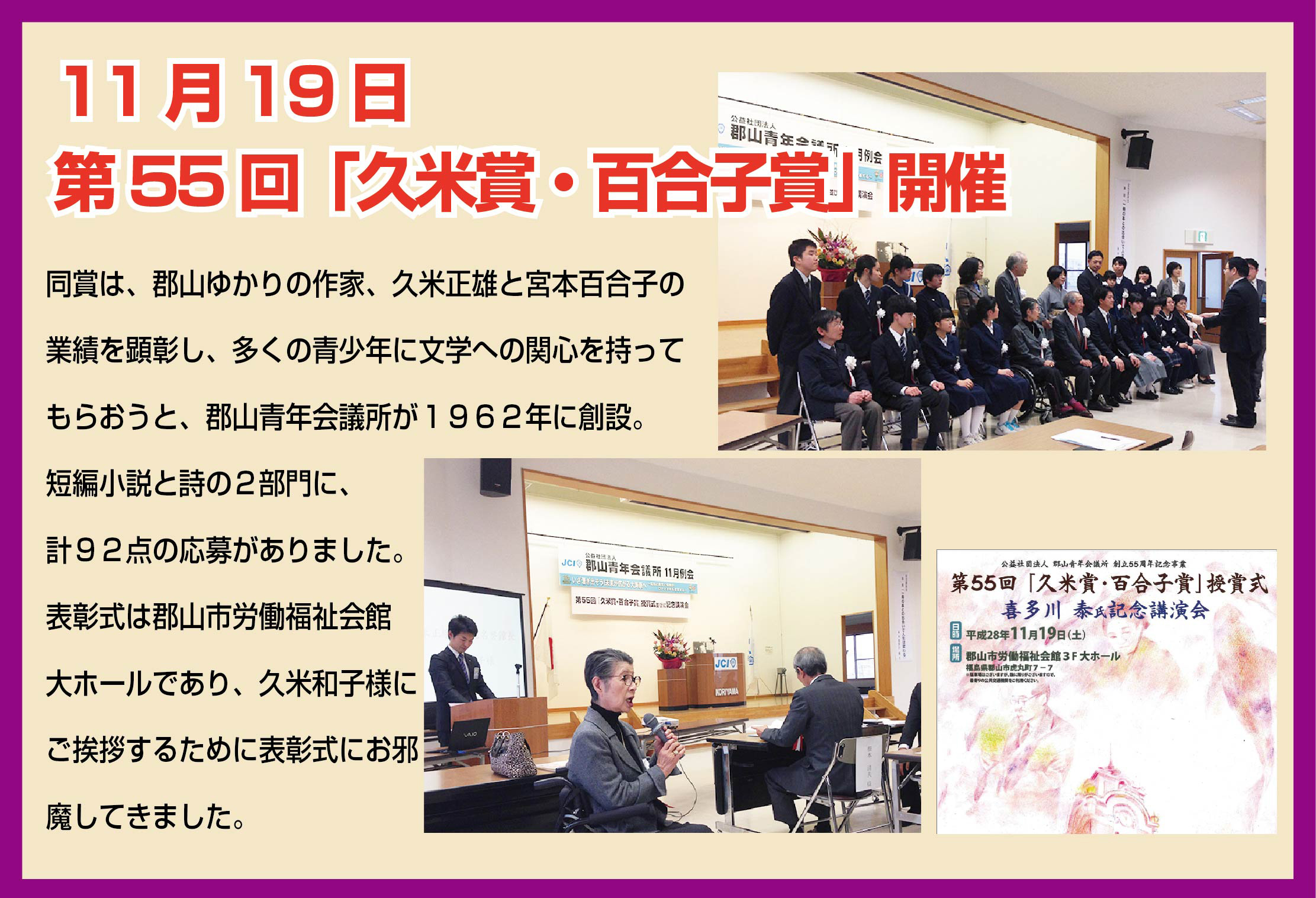 「久米賞・百合子賞」とは郡山青年会議所が50年以上続けている文学賞です。 郡山市に縁のある作家、久米 正雄先生・宮本 百合子先生を顕彰し、毎年、福島県郡山市内の中学3年生を対象に、小説や詩を募集しています。 両先生とも、明治から昭和にかけて活躍した郡山市出身の作家で、郡山市を舞台にした作品を多く発表しています。 久米先生は郡山市開成山にあった牧場をモデルに戯曲「牛乳屋の兄弟(後に『牧場の兄弟』に改題)を書きました。後に、東京の有楽座で上演され、高い評価を受けました。 宮本百合子先生は、若干17歳のときに開拓民たちの過酷な生活ぶりを描いた「貧しき人々の群」で小説家としてデビューしました。