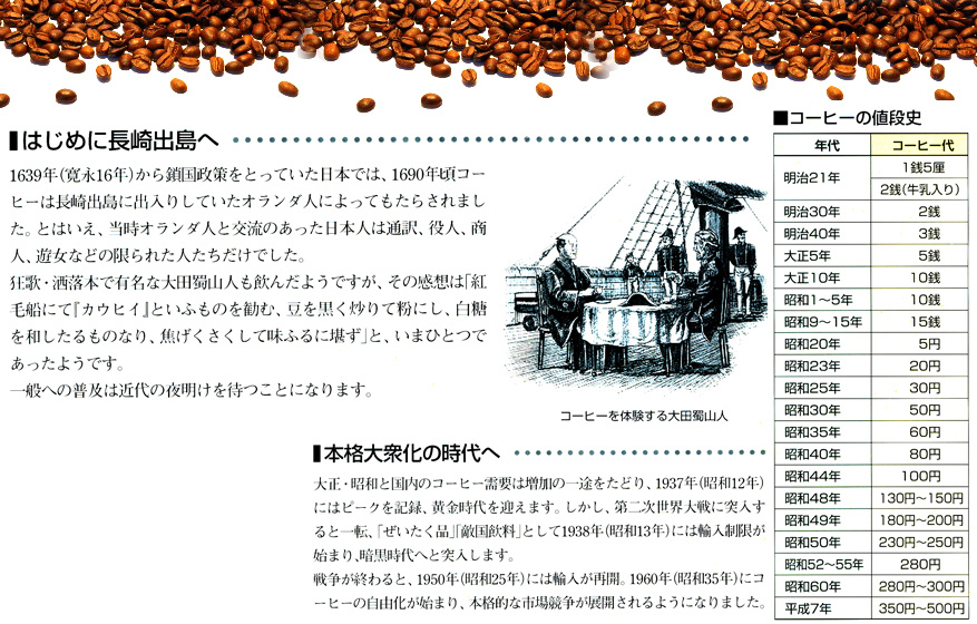 日本には18世紀に長崎の出島にオランダ人が持ち込んだといわれている。出島に出入りしていた一部の日本人がコーヒーを飲用していたと考えられ、出島に出入りすることが許されていた丸山遊郭の遊女の中にはオランダ人からコーヒーを贈られた者もいた。コーヒーについて言及された日本最古の本の1つと考えられている志筑忠雄の『万国管窺』にはわずかながらも記述が存在し、天明年間(1781年 - 1788年)に日本語に訳された『紅毛本草』には「古闘比以」という名でコーヒーの詳細な説明がされている。江戸幕府が敷いていた鎖国政策のため民衆にコーヒーが行き渡らず、また風味が日本人の嗜好に合わなかったため、伝来から普及までに長い時間を要した[178]。1804年にコーヒーを飲んだ大田南畝(大田蜀山人)は、「焦げくさくして味ふるに堪ず」という感想を残した。ヨーロッパ文化に関心を抱く蘭学者や医家はコーヒーを飲んだ感想を記し、大黒屋光太夫などの国外に漂流した者も漂着先でコーヒーを飲用した。出典: フリー百科事典『ウィキペディア(Wikipedia)』
